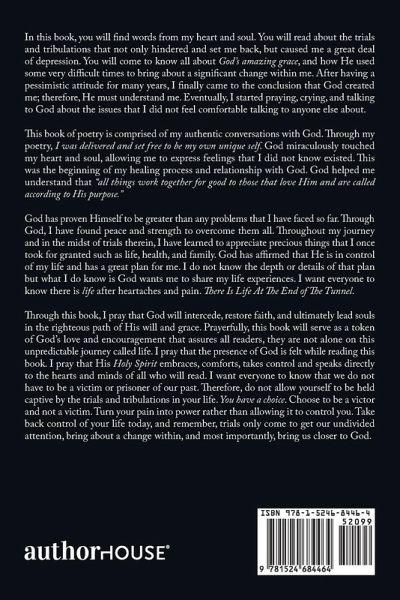 In this book, you will find words from my heart and soul. You will read about the trials and tribulations that not only hindered and set me back, but caused me a great deal of depression. You will come to know all about God's amazing grace, and how He used some very difficult times to bring about a significant change within me. After having a pessimistic attitude for many years, I finally came to the conclusion that God created me; therefore, He must understand me. I started praying, and talking to God about issues that I did not feel comfortable talking to anyone else about. This book of inspirational poetry is comprised of my authentic conversations with God. Through my poetry, I was set free to be my own unique self. Throughout my journey and in the midst of trials therein, I have learned to appreciate precious things that I once took for granted such as life, health, and family. God has affirmed that He is in control of my life and has a great plan for me. I do not know the complete depth or details of that plan, but what I do know is God wants me to share my life experiences. I want everyone to know there is life after heartaches and pain. There Is Life At The End of The Tunnel. Hopefully, this book will serve as a token of God's love and encouragement that helps everyone realize, "you do not have to be a victim or prisoner of your past. You do not have to be held captive by the trials and tribulations in life. You have the ability to turn your pain into power rather than allowing it to control you. You have a choice." Therefore, choose to be a victor and not a victim. I pray that the presence of God is felt while reading this book, He speaks directly to your heart, and inspire you to believe you deserve to live a great life on purpose, in spite of your flaws, and the mistakes that you have made. You deserve the best of everything that life has to offer. Believe it, receive it, and do not settle for anything less. You are not alone. Sincerely, Carla Y. Nixon-Haynes