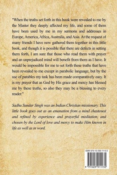 "When the truths set forth in this book were revealed to me by the Master they deeply affected my life, and some of them have been used by me in my sermons and addresses in Europe, America, Africa, Australia, and Asia. At the request of many friends I have now gathered them together in this little book, and though it is possible that there are defects in setting them forth, I am sure that those who read them with prayer and an unprejudiced mind will benefit from them as I have.¿It would be impossible for me to set forth these truths that have been revealed to me except in parabolic language, but by the use of parables my task has been made comparatively easy.¿It is my prayer that as God by His grace and mercy has blessed me by these truths, so also they may be a blessing to every reader." Sadhu Sundar Singh was an Indian Christian missionary. This little book goes out as an emanation from a mind chastened and refined by experience and prayerful meditation, and chosen by the Lord of love and mercy to make Him known in life as well as in word.