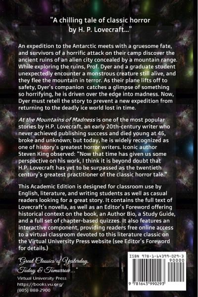 "A chilling tale of classic horror by H. P. Lovecraft..." An expedition to the Antarctic meets with a gruesome fate, and survivors of a horrific attack on their camp discover the ancient ruins of an alien city concealed by a mountain range. While exploring the ruins, Prof. Dyer and a graduate student unexpectedly encounter a monstrous creature still alive, and they flee the mountain in terror. As their plane lifts off to safety, Dyer's companion catches a glimpse of something so horrifying, he is driven over the edge into madness. Now, Dyer must retell the story to prevent a new expedition from returning to the deadly ice world lost in time. At the Mountains of Madness is one of the most popular stories by H.P. Lovecraft, an early 20th-century writer who never achieved publishing success and died young at 46, broke and unknown; but today, he is widely recognized as one of history's greatest horror writers. Iconic author Steven King observed: "Now that time has given us some perspective on his work, I think it is beyond doubt that H.P. Lovecraft has yet to be surpassed as the twentieth century's greatest practitioner of the classic horror tale." This Academic Edition is designed for classroom use by English, literature, and writing students as well as casual readers looking for a great story. It contains the full text of Lovecraft's novella, as well as an Editor's Foreword offering historical context on the book, an Author Bio, a Study Guide, and a full set of chapter-based quizzes. It also features an interactive component, providing readers free online access to a virtual classroom devoted to this literature classic on the Virtual University Press website.