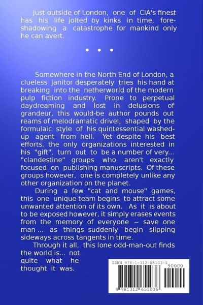Somewhere North of London, a clueless janitor tries his hand at breaking into the netherworld of the modern pulp fiction industry. Prone to perpetual daydreaming and lost in delusions of grandeur, this would-be author pounds out reams of melodramatic drivel, shaped by the formulaic style of his quintessential washed-up agent from hell. Yet despite his best efforts, the only organizations interested in his "gift", turn out to be a number of very... "clandestine" groups who aren't exactly focused on publishing manuscripts. Of these groups however, one is completely unlike any other organization on the planet. During a few "cat and mouse" games, this one unique team begins to attract some unwanted attention of its own. As it is about to be exposed however, it simply erases events from the memory of everyone - save one man... as things suddenly begin slipping sideways across tangents in time. Through it all, this lone odd-man-out finds the world is... not quite what he thought it was.