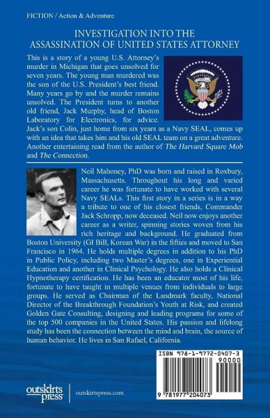 Assassination of a United States Attorney This is a story about a young United States Attorney whose murder in Michigan goes unsolved for seven years. The investigation of this murder covers many suspects, including the militias in Northern Michigan and one of their sponsors, an ill-mannered, offensive and very rich auto parts businessman. The young attorney who was murdered was the son of the United States President's best friend. As he nears the end of his last term without resolution of this suspected assassination, the President turns to another old friend, Jack Murphy, head of Boston Laboratory for Electronics (introduced in The Connection) for advice. Jack's son Colin, just home from six years as a Navy SEAL, comes up with an idea that takes him, his pal Jack Bishop and his old SEAL team on a great adventure which moves them from Washington, D.C. and Boston to Northern Michigan to California and Mexico. Surprising plot, interesting characters and lots of action are featured in this fast moving story. This is the first in a series, introducing Dash Murphy and Jack Bishop. Another entertaining read from the author of The Harvard Square Mob and The Connection.