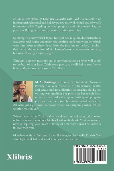 At the River: Poems of Love and Laughter with God is a collection of inspirational, whimsical and holiday poetry that will remind you of what's important in life. Toggling between poignant and witty word play, the poems will brighten your day while making you think. Speaking to controversial topics like politics, religion, deconstruction, sexuality, social justice and more, this uplifting book puts wings on which your mind soars to places deep. From the first line to the last, it is clear that the words come from M.A. Hastings' own deconstruction of faith, her own challenges and changes. Through laughter, tears and quiet conviction, these poems will speak to the beat of your heart. With every poem, you will feel to your bones how madly in love with you is The River.