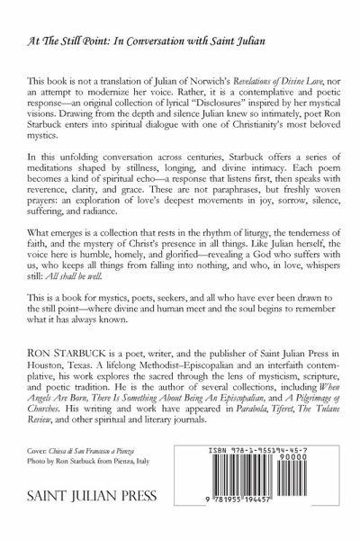 In Conversation with Saint Julian - Praise for At the Still Point In this contemplative and lyrically rich collection, poet Ron Starbuck offers a series of poetic "Disclosures" inspired by Revelations of Divine Love, the visionary 14th-century work by Julian of Norwich. Rather than offering a translation or paraphrase, these original poems are written in reverent response-drawing the reader into an unfolding conversation across centuries. Julian of Norwich, one of the most beloved Christian mystics, received a series of divine revelations in a time marked by plague, political turmoil, and religious upheaval. Yet from this suffering emerged a vision not of wrath, but of radiant mercy. Julian saw Christ as Mother, Companion, and Healer-one who suffers with us, gathers our brokenness, and leads us gently toward union. Her most famous words, "All shall be well, and all manner of thing shall be well," echo throughout this volume as a refrain of radical hope and grace. Starbuck's "Disclosures" take readers into the heart of these themes-Passion and surrender, joy and sorrow, the hidden presence of Christ in daily life, and the sacredness of time itself. Weaving poetic imagination with theological depth, he opens a quiet space for spiritual reflection and mystical awareness. Whether unfolding in a single stanza or through extended meditative passages, each poem speaks with clarity, compassion, and a deep listening to Julian's spirit. This is a book for mystics, seekers, and lovers of sacred poetry. It is a Eucharistic offering-a cup of salvation poured out in verse. It invites readers not just to read, but to dwell in the still point where divine and human meet.