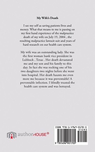 My Wife's Death I see my self as saving patients lives and money. What that means to me is passing on my first hand experience of the malpractice death of my wife on July 19, 2004 , the resulting malpractice lawsuit suit and years of hard research on our health care system. My wife was an outstanding lady. She was the first woman bank vice president in Lubbock , Texas . Her death devastated me and my son and his family to this day. In fact she was rocking one of his two daughters two nights before she went into hospital. Her death haunts me even more me because it was preventable! A preventable infection. I blindly trusted the health care system and was betrayed.