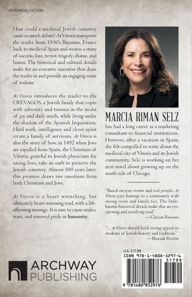 How could a medieval Jewish cemetery cause so much debate? At Vitoria transports the reader from 1950s Bayonne, France back to medieval Spain and weaves a story of success, love, terror, tragedy, shame, and honor. The historical and cultural details make for an evocative narrative that draw the reader in and provide an engaging sense of realism. At Vitoria introduces the reader to the CREVAGOS, a Jewish family that copes with adversity and trauma in the midst of joy and daily needs, while living under the shadow of the Spanish Inquisition. Hard work, intelligence and clever spirit create a family of survivors. At Vitoria is also the story of how, in 1492 when Jews are expelled from Spain, the Christians of Vitoria, grateful to Jewish physicians for saving lives, take an oath to preserve the Jewish cemetery. Almost 500 years later, this promise draws raw emotions from both Christians and Jews. At Vitoria is a heart wrenching, but ultimately heart-warming read, with a life-affirming message. It is sure to cause smiles, tears, and renewed pride in humanity.