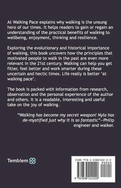 At Walking Pace explains why walking is the unsung hero of our times. It helps readers to gain or regain an understanding of the practical benefits of walking to wellbeing, enjoyment, thinking and resilience.