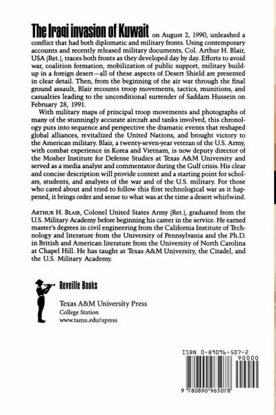The Iraqi invasion of Kuwait on August 2, 1990, unleashed a conflict that had both diplomatic and military fronts. Using contemporary accounts and recently released military documents, Col. Arthur H. Blair, USA (Ret.), traces both fronts as they developed day by day. Efforts to avoid war, coalition formation, mobilization of public support, military build-up in a foreign desert--all of these aspects of Desert Shield are presented in clear detail. Then, from the beginning of the air war through the final ground assault, Blair recounts troop movements, tactics, munitions, and casualties leading to the unconditional surrender of Saddam Hussein on February 28, 1991. With military maps of principal troop movements and photographs of many of the stunningly accurate aircraft and tanks involved, this chronology puts into sequence and perspective the dramatic events that reshaped global alliances, revitalized the United Nations, and brought victory to the American military. Blair, a twenty-seven-year veteran of the U.S. Army, with combat experience in Korea and Vietnam, is now deputy director of the Mosher Institute for Defense Studies at Texas A&M University and served as a media analyst and commentator during the Gulf crisis. His clear and concise description will provide context and a starting point for scholars, students, and analysts of the war and of the U.S. military. For those who cared about and tried to follow this first technological war as it happened, it brings order and sense to what was at the time a desert whirlwind.