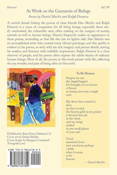 In 1978, Ralph Dranow and Daniel Marlin met while working at the Oakland (CA) main post office. They hit it off immediately, finding a common passion for writing and concern for social justice. Their nascent friendship took root on the level of deep mutual caring as well as support for each other's writing. And in time, they formed a writing group that lasted 38 years until Dan's death in 2017, and continues today with new members. This book is both a testament to the remarkable, incisive writing of Dan Marlin by his best friend, Ralph, and an opportunity for readers to taste the riches of this friendship through the poetry of both writers, Ralph being an equally remarkable poet (though with a different flavor). Sometimes their subjects converge, and other times they follow their own unique paths. But in all cases, readers are in for a moving feast for the mind, heart, and moral spirit. A central thread linking the poems of these two close friends is a sense of compassion for all living beings, especially those easily overlooked, the vulnerable ones, often existing on the margins of society, animals as well as human beings. Humor frequently makes an appearance in these poems, reminding us that life also has its lighter side. Dan Marlin was an accomplished artist who created many vibrant paintings and drawings-some of which appear in this book. This quality of vibrancy is evident in his poems, as well, with his rich imagery and precise details, leaving his readers and listeners with indelible impressions. Ralph Dranow is a close observer of people, and his poems often express the subtle beauty of ordinary human beings. Most of all, the poems in this book pulsate with life, reflecting the joy, wonder, and pain of being alive on this earth. To Be Human Forgive me not the Angel begged, I've brought you no loaves of bread, no honey, not even a single soul. My shoes have turned to dust, my hat to sand, the heaven gold in my pocket is become but ash in the wind, and my wings melted in one small glance of your sun! Good, answered God- now you know, perhaps a little, what it means to be human. -Daniel Marlin Cocoon Only a short distance From the bustle and chatter, The serious business of recreation At the Hawaii Hilton Hotel, Naomi and I lie in a hammock On a balmy winter night Glittering with stars And a full moon. As we gently sway, Our bodies sing, Surrender to night's embrace, The wind licking our faces. We revel in our island of silence, Our silken cocoon, And the untrammeled sky Winking at us, Trembling with light. -Ralph Dranow