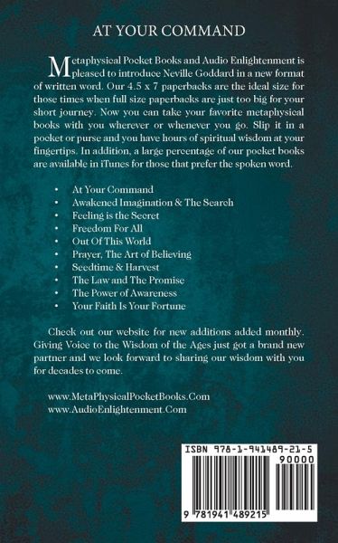 At Your Command, Neville Goddards spiritual classic: Metaphysical Pocket Books and Audio Enlightenment is pleased to introduce Neville Goddard in a new format of written word. Our 4.5 x 7 paperbacks are the ideal size for those times when full size paperbacks are just too big for your short journey. Now you can take your favorite metaphysical books with you wherever or whenever you go. Slip it in a pocket or purse and you have hours of spiritual wisdom at your fingertips. In addition, a large percentage of our pocket books are available in iTunes for those that prefer the spoken word. At Your Command Awakened Imagination & The Search Feeling is the Secret Freedom For All Out Of This World Prayer, The Art of Believing Seedtime & Harvest The Law and The Promise The Power of Awareness Your Faith Is Your Fortune Check out our website for new additions added monthly. Giving Voice to the Wisdom of the Ages just got a brand new partner and we look forward to sharing our wisdom with you for decades to come.
