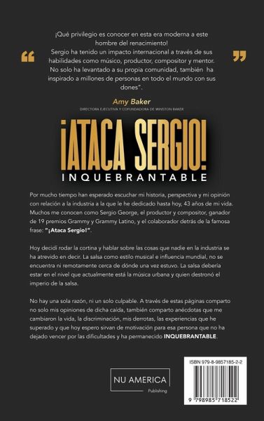 Sergio George es una amenaza global- Tommy Mottola, Ejecutivo Icónico de la Musica Por mucho tiempo han esperado escuchar mi historia, perspectiva y mi opinión con relación a la industria a la que le he dedicado hasta hoy, 43 años de mi vida. Muchos me conocen como Sergio George, el productor y compositor, ganador de 19 premios Grammy y Grammy Latino, y el colaborador detrás de la famosa frase: "¡Ataca Sergio!".Hoy decidí rodar la cortina y hablar sobre las cosas que nadie en la industria se ha atrevido en decir. La salsa como estilo musical e influencia mundial, no se encuentra ni remotamente cerca de dónde una vez estuvo. La salsa debería estar en el nivel que actualmente está la música urbana y quien destronó el imperio de la salsa.No hay una sola razón, ni un solo culpable. A través de estas páginas comparto no solo mis opiniones de dicha caída, también comparto anécdotas que me cambiaron la vida, la discriminación, mis derrotas, las experiencias que he superado y que hoy espero sirvan de motivación para esa persona que no se ha dejado vencer por las dificultades y ha permanecido INQUEBRANTABLE.