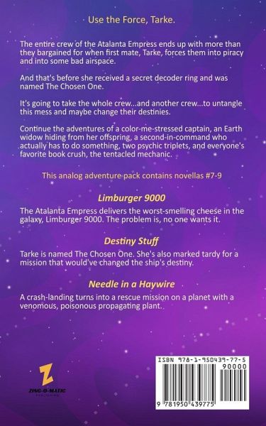 Use the Force, Tarke. The entire crew of the Atalanta Empress ends up with more than they bargained for when first mate Tarke forces them into piracy and into some bad airspace. And that's before she received a secret decoder ring and was named The Chosen One. It's going to take the whole crew...and another crew...to untangle this mess and maybe change their destinies. Atalan Adventures Pack #3 contains novellas #7-9 in one handy digital parcel. Limburger 9000 The Atalanta Empress delivers the worst-smelling cheese in the galaxy, Limburger 9000. The problem is, no one wants it. Destiny Stuff Tarke is named The Chosen One. She's also marked tardy for a mission that would've changed the Atalan's destiny. Needle in a Haywire Crash-landing turns into a rescue mission on a planet with a venomous, poisonous propagating plant. This space romp keeps rolling. Join in!