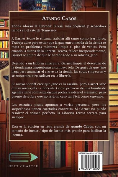 Todos adoran la Librería Teresa, una pequeña y acogedora tienda en el este de Tennessee. A Garnet Stone le encanta trabajar allí tanto como leer libros. Trabaja duro para evitar que la gata entrometida de la tienda se meta en problemas mientras limpia el piso de ventas. Pero cuando la dueña de la librería, Teresa, fallece inesperadamente, Garnet se entera de que le heredó todo a su sobrina, Jane. Dejando a un lado su amargura, Garnet limpia el desorden de la tienda para impresionar a su nueva jefa. Después de que Jane llega para anunciar el cierre de la tienda, las cosas empeoran y se encuentra otro cadáver en la librería. El nuevo sheriff cree que Jane es la asesina, pero Garnet sabe que su nueva jefa es inocente. Como proviene de una familia de agentes tiene confianza en que podrá resolver el asesinato, pero pronto descubre que no será un caso tan fácil como esperaba. Las extrañas pistas apuntan a varias personas, pero los sospechosos tienen coartadas concretas. Si Garnet no puede resolver el crimen perfecto, la Librería Teresa cerrará para siempre. Edición de Letra Grande