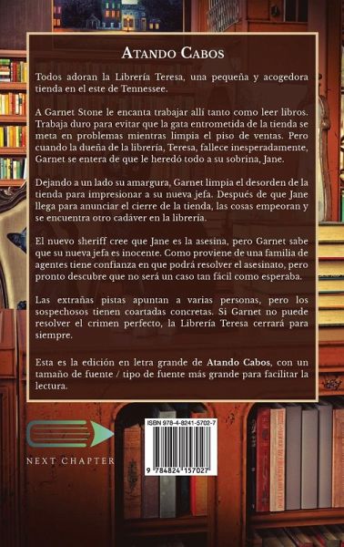 Todos adoran la Librería Teresa, una pequeña y acogedora tienda en el este de Tennessee. A Garnet Stone le encanta trabajar allí tanto como leer libros. Trabaja duro para evitar que la gata entrometida de la tienda se meta en problemas mientras limpia el piso de ventas. Pero cuando la dueña de la librería, Teresa, fallece inesperadamente, Garnet se entera de que le heredó todo a su sobrina, Jane. Dejando a un lado su amargura, Garnet limpia el desorden de la tienda para impresionar a su nueva jefa. Después de que Jane llega para anunciar el cierre de la tienda, las cosas empeoran y se encuentra otro cadáver en la librería. El nuevo sheriff cree que Jane es la asesina, pero Garnet sabe que su nueva jefa es inocente. Como proviene de una familia de agentes tiene confianza en que podrá resolver el asesinato, pero pronto descubre que no será un caso tan fácil como esperaba. Las extrañas pistas apuntan a varias personas, pero los sospechosos tienen coartadas concretas. Si Garnet no puede resolver el crimen perfecto, la Librería Teresa cerrará para siempre. Edición de Letra Grande