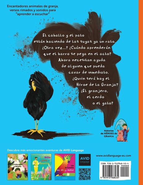 El caballo y el pato están haciendo de las suyas ya un rato. ¿Otra vez...? ¿Cuándo aprenderán que el barro se pega en el acto? Ahora necesitan ayuda de alguien que pueda cavar de inmediato. ¿Quién será hoy el Héroe de la Granja? ¿El granjero, el cerdo o el gato? Otra vivaz historia de Héroes de Granja, contada en verso rimado y repleta de sonidos para "aprender a escuchar", que cobra vida gracias a las preciosas ilustraciones de Faith Broomfield-Payne, del alegre equipo de animales de la granja. Desde el burro que rebuzna (hiaaa hiaaa hiaaa) hasta el cuervo que grazna (cro cro cro), todos están allí para presenciar cómo el pato juguetón y el apuesto caballo se meten en una situación bastante peliaguda... pero ¿quién acudirá al rescate y será declarado el Héroe de la Granja? La historia comienza con el intercambio de papeles entre los animales nocturnos y los diurnos: cuando unos se duermen, los otros despiertan... y lo mismo ocurre con el granjero, que vuelve para su dosis diaria de diversión en la granja. Como recordaréis de la primera historia de Héroes de Granja, "Ayudando a Bruno", el granjero es sordo y lleva implantes cocleares que le ayudan a oír. Le encanta escuchar todos los sonidos de la granja (desde los cerdos y los caballos hasta los perros y los gallos) y nunca es más feliz que cuando está rodeado de todos sus amigos los animales. Aunque este libro está protagonizado por un personaje sordo, no trata específicamente de la pérdida de audición; es una historia encantadora, humorística e inclusiva para el disfrute de todos los niños, tengan o no pérdida de audición.