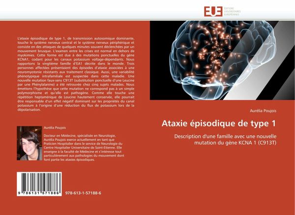 L'ataxie épisodique de type 1, de transmission autosomique dominante, touche le système nerveux central et le système nerveux périphérique et consiste en des attaques de quelques minutes souvent déclenchées par un mouvement brusque. L'examen entre les crises est normal en dehors de myokimies. Cette forme est due à des mutations ponctuelles du gène KCNA1, codant pour les canaux potassium voltage-dépendants. Nous rapportons la vingtième famille d'EA1 décrite dans le monde. Trois personnes affectées présentaient des épisodes d'ataxie associées à une neuromyotonie résistants aux traitement classique. Aussi, une variabilité phénotypique intrafamiliale est suspectée dans cette maladie. Une nouvelle mutation faux-sens C913T (substitution ponctuelle d'une Leucine par une Phénylalanine) a été retrouvée chez cinq sujets malades. Nous émettons l'hypothèse que cette mutation ne correspond pas à un simple polymorphisme et qu'elle est pathogène. Comme elle touche une répétition heptamérique de Leucine hautement conservée, elle pourrait être responsable d'un effet négatif dominant sur les propriétés du canal potassium à l'origine d'une réduction du flux de potassium lors de la dépolarisation.