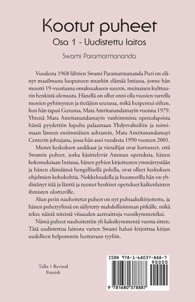 Vuodesta 1968 lähtien Swami Paramatmananda Puri on elänyt maailmasta luopuneen munkin elämää Intiassa, jonne hän muutti 19-vuotiaana omaksuakseen suuren, muinaisen kulttuurin henkistä olemusta. Hänellä on ollut onni olla vuosien varrella monien pyhimysten ja tietäjien seurassa, mikä huipentui siihen, kun hän tapasi Gurunsa, Mata Amritanandamayin vuonna 1979. Yhtenä Mata Amritanandamayin vanhimmista opetuslapsista häntä pyydettiin lopulta palaamaan Yhdysvaltoihin ja toimimaan lännen ensimmäisen ashramin, Mata Amritanandamayi Centerin johtajana, jossa hän asui vuodesta 1990 vuoteen 2001. Monet keskuksen asukkaat ja vierailijat ovat kertoneet, että Swamin puheet, jotka käsittelevät Amman opetuksia, hänen kokemuksiaan Intiassa, hänen pyhien kirjoitusten ymmärrystään ja hänen elämäänsä hengellisellä polulla, ovat olleet keskuksen ohjelmien kohokohtia. Nokkeluudella ja huumorilla hän on yhdistänyt itää ja länttä ja tuonut henkiset opetukset kaikenlaisten ihmisten ulottuville. Alun perin nauhoitetut puheet on nyt puhtaaksikirjoitettu, ja hänen puhetyylinsä on säilytetty mahdollisimman pitkälle, mikä tekee näistä niteistä viisauden aarreaittoja vuosikymmeniksi. Nämä puheet nauhoitettiin yli kaksikymmentä vuotta sitten. Tätä uudistettua laitosta varten Swami halusi kirjoittaa kirjan uudelleen helpommin luettavaan tyyliin. Published By The Disciples Of Mata Amritanandamayi Devi, Affectionately Known As Mother, Or Amma The Hugging Saint.