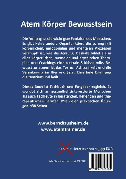 Die Atmung ist die wichtigste Funktion des Menschen. Es gibt keine andere Organfunktion, die so eng mit körperlichen, emotionalen und mentalen Prozessen verknüpft ist, wie die Atmung. Deshalb bildet sie in allen körperlichen, mentalen und psychischen Therapien und Coachings eine zentrale Schlüsselrolle. Bewusst zu atmen ist das Tor zur Achtsamkeit und die Verankerung im Hier und Jetzt. Eine tiefe Erfahrung die zentriert und heilt. Dieses Buch ist Fachbuch und Ratgeber zugleich. Es wendet sich an gesundheitsinteressierte Menschen als auch Fachleute in beratenden, helfenden und therapeutischen Berufen. Mit vielen praktischen Übungen. 188 Seiten.