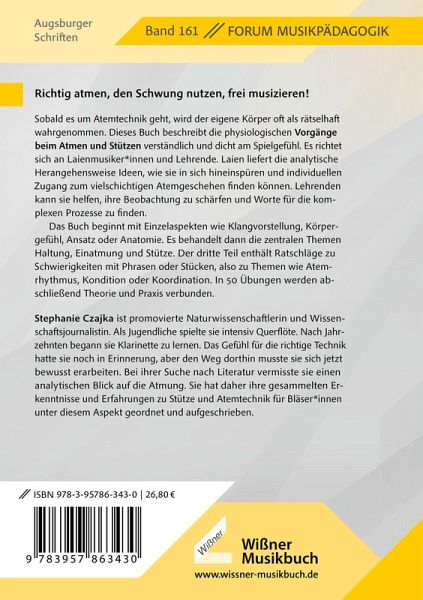 Sobald es um Atemtechnik geht, wird der eigene Körper oft als rätselhaft wahrgenommen. Dieses Buch beschreibt die physiologischen Vorgänge beim Atmen und Stützen verständlich und dicht am Spielgefühl. Es richtet sich an Laienmusiker_innen und Lehrende. Laien liefert die analytische Herangehensweise Ideen, wie sie in sich hineinspüren und individuellen Zugang zum vielschichtigen Atemgeschehen finden können. Lehrenden kann sie helfen, ihre Beobachtung zu schärfen und Worte für die komplexen Prozesse zu finden.Das Buch beginnt mit Einzelaspekten wie Klangvorstellung, Körpergefühl, Ansatz oder Anatomie. Es behandelt dann die zentralen Themen Haltung, Einatmung und Stütze. Der dritte Teil enthält Ratschläge zu Schwierigkeiten mit Phrasen oder Stücken, also zu Themen wie Atemrhythmus, Kondition oder Koordination. In 50 Übungen werden abschließend Theorie und Praxis verbunden.