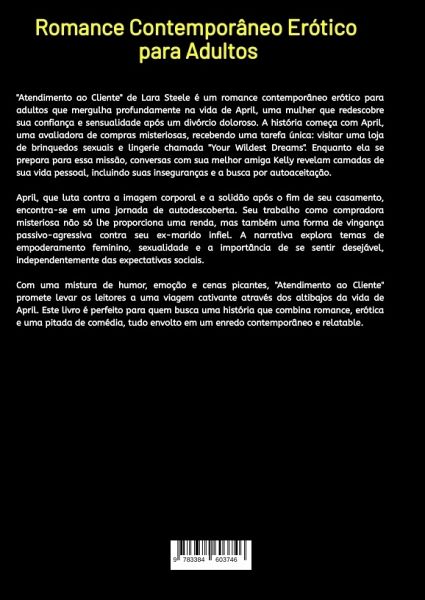 "Atendimento ao Cliente" de Lara Steele é um romance contemporâneo erótico para adultos que mergulha profundamente na vida de April, uma mulher que redescobre sua confiança e sensualidade após um divórcio doloroso. A história começa com April, uma avaliadora de compras misteriosas, recebendo uma tarefa única: visitar uma loja de brinquedos sexuais e lingerie chamada "Your Wildest Dreams". Enquanto ela se prepara para essa missão, conversas com sua melhor amiga Kelly revelam camadas de sua vida pessoal, incluindo suas inseguranças e a busca por autoaceitação.April, que luta contra a imagem corporal e a solidão após o fim de seu casamento, encontra-se em uma jornada de autodescoberta. Seu trabalho como compradora misteriosa não só lhe proporciona uma renda, mas também uma forma de vingança passivo-agressiva contra seu ex-marido infiel. A narrativa explora temas de empoderamento feminino, sexualidade e a importância de se sentir desejável, independentemente das expectativas sociais.Com uma mistura de humor, emoção e cenas picantes, "Atendimento ao Cliente" promete levar os leitores a uma viagem cativante através dos altibajos da vida de April. Este livro é perfeito para quem busca uma história que combina romance, erótica e uma pitada de comédia, tudo envolto em um enredo contemporâneo e relatable.
