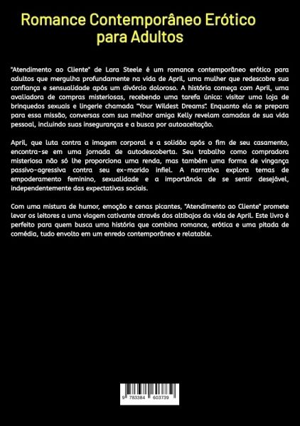 "Atendimento ao Cliente" de Lara Steele é um romance contemporâneo erótico para adultos que mergulha profundamente na vida de April, uma mulher que redescobre sua confiança e sensualidade após um divórcio doloroso. A história começa com April, uma avaliadora de compras misteriosas, recebendo uma tarefa única: visitar uma loja de brinquedos sexuais e lingerie chamada "Your Wildest Dreams". Enquanto ela se prepara para essa missão, conversas com sua melhor amiga Kelly revelam camadas de sua vida pessoal, incluindo suas inseguranças e a busca por autoaceitação.April, que luta contra a imagem corporal e a solidão após o fim de seu casamento, encontra-se em uma jornada de autodescoberta. Seu trabalho como compradora misteriosa não só lhe proporciona uma renda, mas também uma forma de vingança passivo-agressiva contra seu ex-marido infiel. A narrativa explora temas de empoderamento feminino, sexualidade e a importância de se sentir desejável, independentemente das expectativas sociais.Com uma mistura de humor, emoção e cenas picantes, "Atendimento ao Cliente" promete levar os leitores a uma viagem cativante através dos altibajos da vida de April. Este livro é perfeito para quem busca uma história que combina romance, erótica e uma pitada de comédia, tudo envolto em um enredo contemporâneo e relatable.