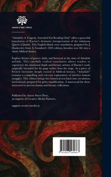 "Athaliah: A Tragedy, Intended For Reading Only" offers a powerful translation of Racine's dramatic interpretation of the infamous Queen of Judah. This English blank verse translation, prepared by J. Donkersley from A. Gombert's 1825 edition, breathes new life into a classic biblical drama. Explore themes of power, faith, and betrayal as the story of Athaliah unfolds. This carefully crafted translation allows readers to experience the emotional depth and literary artistry of Racine's work, originally intended for the page rather than the stage. As a piece of French literature deeply rooted in biblical history, "Athaliah" remains a compelling and relevant exploration of timeless human struggles. This edition brings this historical text back into circulation, meticulously prepared for print republication. A must-read for those interested in ancient drama and literary collections. This work has been selected by scholars as being culturally important, and is part of the knowledge base of civilization as we know it. This work is in the public domain in the United States of America, and possibly other nations. Within the United States, you may freely copy and distribute this work, as no entity (individual or corporate) has a copyright on the body of the work. Scholars believe, and we concur, that this work is important enough to be preserved, reproduced, and made generally available to the public. We appreciate your support of the preservation process, and thank you for being an important part of keeping this knowledge alive and relevant.