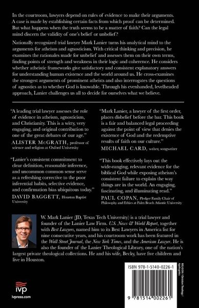 In the courtroom, lawyers establish certain facts to prove their cases. But can the legal mind discern the validity of one's belief or unbelief? With an even-handed approach, nationally recognized trial lawyer Mark Lanier explores whether atheistic frameworks give satisfactory answers for understanding human existence and considers the questions of agnostics as to whether God is knowable.