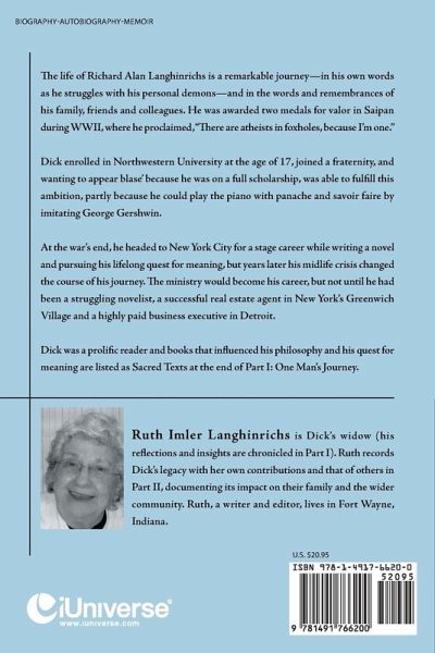 The life of Richard Alan Langhinrichs is a remarkable journey-in his own words as he struggles with his personal demons-and in the words and remembrances of his family, friends and colleagues. He was awarded two medals for valor in Saipan during WWII, where he proclaimed, "There are atheists in foxholes, because I'm one." Dick enrolled in Northwestern University at the age of 17, joined a fraternity, and wanting to appear blase' because he was on a full scholarship, was able to fulfill this ambition, partly because he could play the piano with panache and savoir faire by imitating George Gershwin. At the war's end, he headed to New York City for a stage career while writing a novel and pursuing his lifelong quest for meaning, but years later his midlife crisis changed the course of his journey. The ministry would become his career, but not until he had been a struggling novelist, a successful real estate agent in New York's Greenwich Village and a highly paid business executive in Detroit. Dick was a prolific reader and books that influenced his philosophy and his quest for meaning are listed as Sacred Texts at the end of Part I: One Man's Journey.
