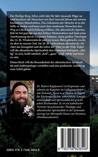 Der Heilige Berg Athos zieht Jahr für Jahr tausende Pilger an und fasziniert die Menschen seit über tausend Jahren mit seinem besonderen Mönchsleben. Das Geheimnis der Mönche ist in der Stille zu finden und kann auch dem modernen Menschen den Weg zu Glück und Erfüllung eröffnen. Die athonitische Spiritualität ist tief geprägt von den frühen Wüstenvätern und fand seine Anerkennung durch Gregorios Palamas, einen großen Theologen des 14. Jh. Wiederentdeckt und zur neuen Blüte gebracht, wurde sie aber in unserer Zeit, u.a. von Metropolit Naum von Strumica. Im 20. Jh. verbreiteten athonitische Altväter das Jesusgebet und die Lehre der Väter über Paris und England bis nach Amerika. Heute gehört die athonitische Spiritualität nicht nur zur orthodoxen Kirche, sondern wird auch in der katholischen Kirche als gemeinsames Erbe von Ost und West angesehen. Dabei will die athonitische Spiritualität den Menschen heil(ig)en. "Heilig" zu sein, heißt nämlich "heil", "ganz" (engl. whole und holy) zu sein. Die Mönche des Heiligen Berges möchten nicht von der Welt fliehen, sondern sie möchten erst einmal allein "ganz Mensch" werden, um dann der Welt dienen zu können und mit ihr All-Eins zu werden. Große Altväter, wie Sophrony von Essex oder Ephraim von Arizona, haben bewusst ihre Erfahrungen aus der Stille des Athos der westlichen Welt zugänglich gemacht und so auch modernen Menschen geholfen, Gott zu suchen und zu finden. Das Buch will die Besonderheit der athonitischen Spiritualität und Anthropologie vorstellen und praktische Anleitung zum Gebet geben.