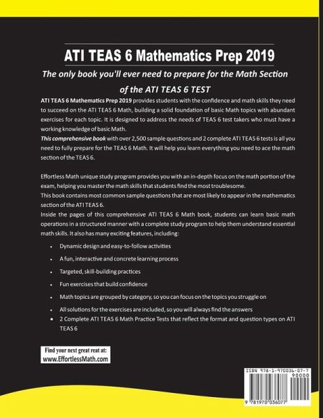 ATI TEAS 6 Mathematics Prep 2019 provides students with the confidence and math skills they need to succeed on the ATI TEAS 6 Math, building a solid foundation of basic Math topics with abundant exercises for each topic. It is designed to address the needs of TEAS 6 test takers who must have a working knowledge of basic Math. This comprehensive book with over 2,500 sample questions and 2 complete ATI TEAS 6 tests is all you need to fully prepare for the TEAS 6 Math. It will help you learn everything you need to ace the math section of the TEAS 6. Effortless Math unique study program provides you with an in-depth focus on the math portion of the exam, helping you master the math skills that students find the most troublesome. This book contains most common sample questions that are most likely to appear in the mathematics section of the ATI TEAS 6. Inside the pages of this comprehensive ATI TEAS 6 Math book, students can learn basic math operations in a structured manner with a complete study program to help them understand essential math skills. It also has many exciting features, including: Dynamic design and easy-to-follow activities A fun, interactive and concrete learning process Targeted, skill-building practices Fun exercises that build confidence Math topics are grouped by category, so you can focus on the topics you struggle on All solutions for the exercises are included, so you will always find the answers 2 Complete ATI TEAS 6 Math Practice Tests that reflect the format and question types on ATI TEAS 6 ATI TEAS 6 Mathematics Prep 2019 is an incredibly useful tool for those who want to review all topics being covered on the ATI TEAS 6 test. It efficiently and effectively reinforces learning outcomes through engaging questions and repeated practice, helping you to quickly master basic Math skills.