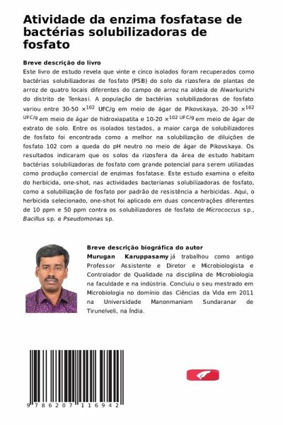 Breve descrição do livroEste livro de estudo revela que vinte e cinco isolados foram recuperados como bactérias solubilizadoras de fosfato (PSB) do solo da rizosfera de plantas de arroz de quatro locais diferentes do campo de arroz na aldeia de Alwarkurichi do distrito de Tenkasi. A população de bactérias solubilizadoras de fosfato variou entre 30-50 ×102 UFC/g em meio de ágar de Pikovskaya, 20-30 ×102 UFC/g em meio de ágar de hidroxiapatita e 10-20 ×102 UFC/g em meio de ágar de extrato de solo. Entre os isolados testados, a maior carga de solubilizadores de fosfato foi encontrada como a melhor na solubilização de diluições de fosfato 102 com a queda do pH neutro no meio de ágar de Pikovskaya. Os resultados indicaram que os solos da rizosfera da área de estudo habitam bactérias solubilizadoras de fosfato com grande potencial para serem utilizadas como produção comercial de enzimas fosfatase. Este estudo examina o efeito do herbicida, one-shot, nas actividades bacterianas solubilizadoras de fosfato, como a solubilização de fosfato por padrão de resistência a herbicidas. Aqui, o herbicida selecionado, one-shot foi aplicado em duas concentrações diferentes de 10 ppm e 50 ppm contra os solubilizadores de fosfato de Micrococcus sp., Bacillus sp. e Pseudomonas sp.