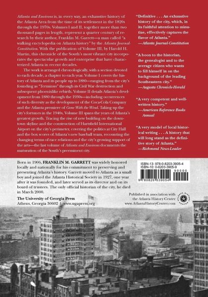 Atlanta and Environs is, in every way, an exhaustive history of the Atlanta Area from the time of its settlement in the 1820s through the 1970s. Volumes I and II, together more than two thousand pages in length, represent a quarter century of research by their author, Franklin M. Garrett--a man called "a walking encyclopedia on Atlanta history" by the Atlanta Journal-Constitution. With the publication of Volume III, by Harold H. Martin, this chronicle of the South's most vibrant city incorporates the spectacular growth and enterprise that have characterized Atlanta in recent decades. The work is arranged chronologically, with a section devoted to each decade, a chapter to each year. Volume I covers the history of Atlanta and its people up to 1880--ranging from the city's founding as "Terminus" through its Civil War destruction and subsequent phoenixlike rebirth. Volume II details Atlanta's development from 1880 through the 1930s--including occurrences of such diversity as the development of the Coca-Cola Company and the Atlanta premiere of Gone with the Wind. Taking up the city's fortunes in the 1940s, Volume III spans the years of Atlanta's greatest growth. Tracing the rise of new building on the downtown skyline and the construction of Hartsfield International Airport on the city's perimeter, covering the politics at City Hall and the box scores of Atlanta's new baseball team, recounting the changing terms of race relations and the city's growing support of the arts, the last volume of Atlanta and Environs documents the maturation of the South's preeminent city.