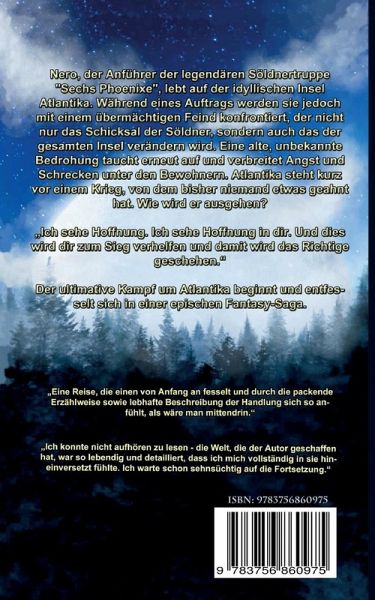 Nero, der Anführer der legendären Söldnertruppe: Sechs Phoenixe, lebt auf der idyllischen Insel Atlantika. Während eines Auftrags werden sie jedoch mit einem übermächtigen Feind konfrontiert, der nicht nur das Schicksal der Söldner, sondern auch das der gesamten Insel verändern wird. Eine alte, unbekannte Bedrohung taucht erneut auf und verbreitet Angst und Schrecken unter den Bewohnern. Atlantika steht kurz vor einem Krieg, von dem bisher niemand etwas geahnt hat. Wie wird er ausgehen?Ich sehe Hoffnung. Ich sehe Hoffnung in dir. Und dies wird dir zum Sieg verhelfen und damit wird das Richtige geschehen.Der ultimative Kampf um Atlantika beginnt und entfesselt sich in einer epischen Fantasy-Saga.