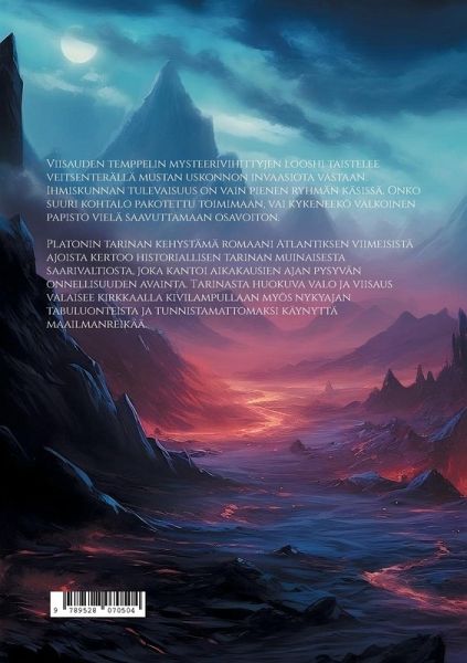 Viisauden temppelin mysteerivihittyjen looshi taistelee veitsenterällä mustan uskonnon invaasiota vastaan. Ihmiskunnan tulevaisuus on vain pienen ryhmän käsissä. Onko suuri kohtalo pakotettu toimimaan, vai kykeneekö valkoinen papisto vielä saavuttamaan osavoiton. Platonin tarinan kehystämä romaani Atlantiksen viimeisistä ajoista kertoo historiallisen tarinan muinaisesta saarivaltiosta, joka kantoi aikakausien ajan pysyvän onnellisuuden avainta. Tarinasta huokuva valo ja viisaus valaisee kirkkaalla kivilampullaan myös nykyajan tabuluonteista ja tunnistamattomaksi käynyttä maailmanreikää.
