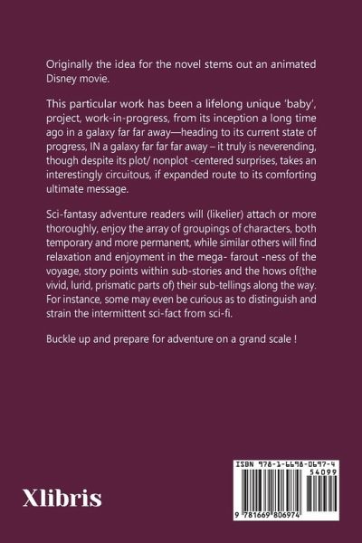Originally the idea for the novel stems out an animated Disney movie. This particular work has been a lifelong unique 'baby', project, work-in-progress, from its inception a long time ago in a galaxy far far away-heading to its current state of progress, IN a galaxy far far far away - it truly is neverending, though despite its plot/ nonplot -centered surprises, takes an interestingly circuitous, if expanded route to its comforting ultimate message. Sci-fantasy adventure readers will (likelier) attach or more thoroughly, enjoy the array of groupings of characters, both temporary and more permanent, while similar others will find relaxation and enjoyment in the mega- farout -ness of the voyage, story points within sub-stories and the hows of(the vivid, lurid, prismatic parts of) their sub-tellings along the way. For instance, some may even be curious as to distinguish and strain the intermittent sci-fact from sci-fi. Buckle up and prepare for adventure on a grand scale !
