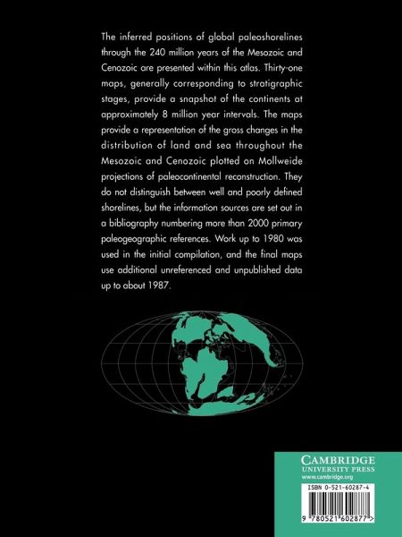 The inferred positions of global paleoshorelines through the 240 million years of the Mesozoic and Cenozoic are presented within this atlas. Thirty-one maps, generally corresponding to stratigraphic stages, provide a snapshot of the continents and their shorelines at approximately 8 million year intervals. The maps provide a representation of the gross changes in the distribution of land and sea throughout the Mesozoic and Cenozoic plotted on Mollweide projections of paleocontinental reconstruction. They do not distinguish between well and poorly defined shorelines, but the information sources are set out in a bibliography numbering more than 2000 primary paleographic references. This is a global compilation that presents the first attempt at delineating global shorelines at stage level, and which represents many years of work sponsored by British Petroleum International (BPI), and work by BPI themselves between 1981 and 1987.