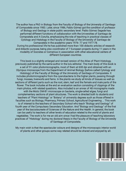 The atlas includes photomicrographs from the cyanobacteria to the higher plants, passing through fungi, mosses, liverworts and ferns. In the plants we study all kinds of tissues as well as sections of different parts such as the root, stem, leaf and the female and male parts of the flower. The work is aimed at both students and teachers of "Plant Histology" or "Botany" in university degrees such as those offered in faculties such as Biology, Pharmacy, Teaching, Agricultural Engineering... The main objective is to reveal the unsuspected beauty of the plant world at a microscopic level, which will surely help us better appreciate the nature that surrounds us.