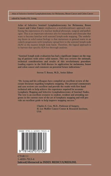 Atlas of Selective Lymphadenectomy for Melanoma, Breast Cancer and Colon Cancer emphasizes a multidisciplinary approach combining the experiences of a nuclear medicine physician, surgeon, and pathologist. This is an important reference also for researchers and clinicians who want to become familiar with sentinel lymph node mapping. The underlying thesis in solid tumor biology is that metastasis in general starts in an orderly progression with lymphatic spread first to the sentinel lymph node (SLN) in the nearest lymph node basin. Therefore, the logical approach is to harvest that specific SLN for thorough analysis.