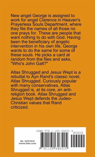 New angel George is assigned to work for angel Clarence in Heaven's Prayerless Souls Department, where they file the names of all those no one prays for. These are people that want nothing to do with God. Having been the beneficiary of angelic intervention in his own life, George wants to do the same for some of these souls. He picks a card at random from the files and asks, "Who's John Galt?" Atlas Shrugged and Jesus Wept is a rebuttal to Ayn Rand's classic novel, Atlas Shrugged. Curiously popular with many conservatives, Atlas Shrugged is, at its core, an anti-religion book. Atlas Shrugged and Jesus Wept defends the Judeo-Christian values that Rand criticized.
