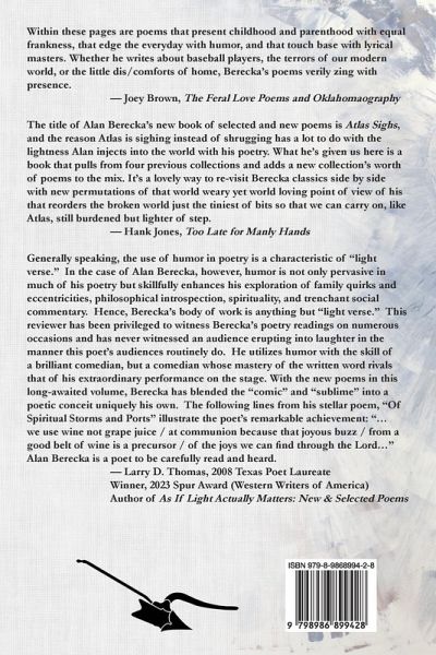 Atlas Sighs: Selected and New Poems, by Alan Berecka, brings together the best of the poet's previously published volumes, and includes a section of his most recent work. As Ken Hada notes in his introduction, "Alan Berecka's Atlas Sighs: Selected and New Poems offers readers a bountiful collection of narrative poems in which the poet, indeed, finds the 'right, true thing' for each poem."