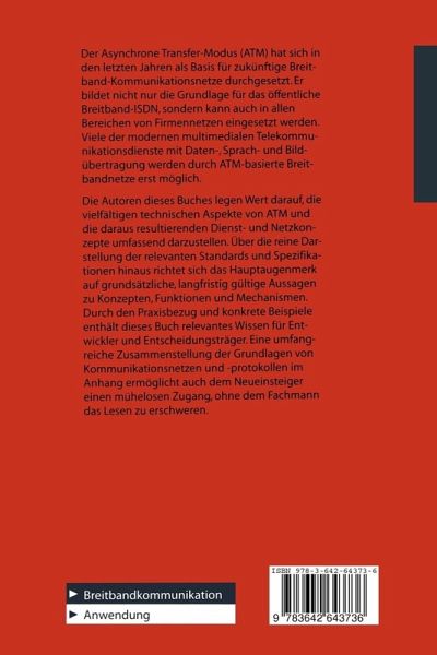 Der Asynchrone Transfer-Modus (ATM) bildet als schnelle Paketvermittlungstechnik die Basis für das Breitband-ISDN. Viele moderne Telekommunikationsdienste mit Daten-, Bild- und Sprachübertragung werden dadurch erst ermöglicht. Die Autoren dieses Buches legen Wert darauf, die vielen technischen Aspekte von ATM gemäß Ihrer Relevanz für Entwickler und Entscheidungsträger darzustellen. Das Auflisten von Standards wird auf das Nötigste eingeschränkt, Firmenspezifika werden vermieden. Dafür richtet sich das Hauptaugenmerk auf grundsätzliche, langfristig gültige Aussagen zu Funktionen und Mechanismen.