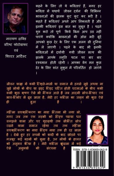 Emotions, which have been eroded by the influence of emotions, can be called the flow of sentences. When a person who is full of such emotions, poems emerges with expressions, he/she is called a poet. Sometime in the life journey, between relationships or the people who are not connected with us in the society or happenings around them, sometimes there are moments when a man gets immersed in thoughts and emotions, my every poem has been born like this. Whatever the slogan of women empowerment, but as long as a girl is considered to be only alien wealth and a house-bound society, the slogan of women empowerment remains only till the slogan. Having seen that every dream many sisters are forced to leave after marriage, so many girls have shared their current miserable situation and experiences. My poetry series has the structure of many such experiences. These are poems to say, but every poem has a glimpse of different emotions of real life philosophy. It is said that poems come out on their own and their poems are proof of this fact. Start reading, then you will not be able to get up without completing it because dew filled with emotions will take you to a different world for some time. Even after reading, the glimpses of the life truth shown in her poems will be visible on your memory table again and again. Your mood will change to calm for sometime.