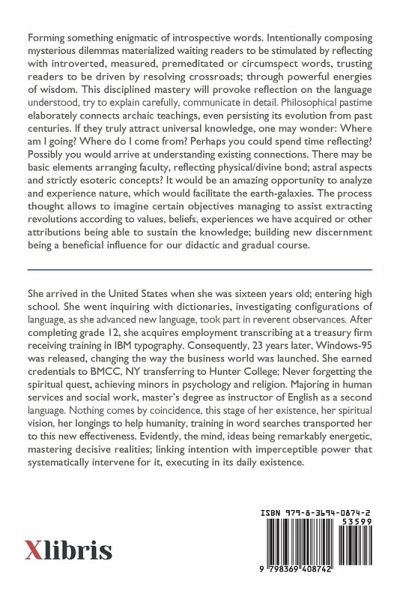 Forming something enigmatic of introspective words. Intentionally composing mysterious dilemmas materialized waiting readers to be stimulated by reflecting with introverted, measured, premeditated or circumspect words, trusting readers to be driven by resolving crossroads; through powerful energies of wisdom. This disciplined mastery will provoke reflection on the language understood, try to explain carefully, communicate in detail. Philosophical pastime elaborately connects archaic teachings, even persisting its evolution from past centuries. If they truly attract universal knowledge, one may…mehr