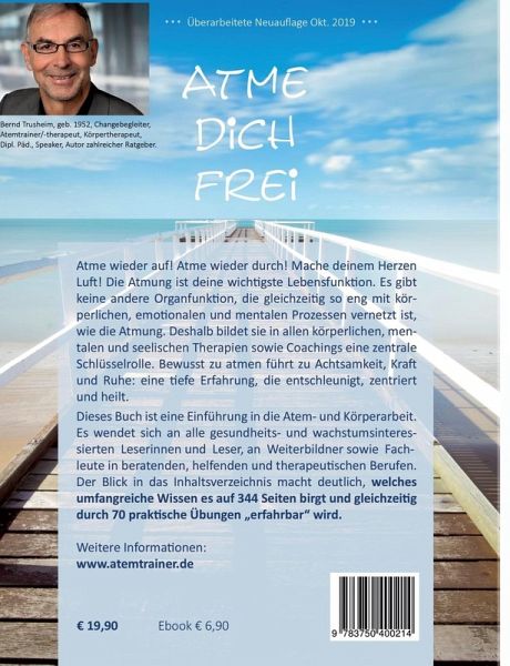 Atme wieder auf! Atme wieder durch! Mache deinem Herzen Luft! Die Atmung ist deine wichtigste Lebensfunktion. Es gibt keine andere Organfunktion, die gleichzeitig so eng mit körperlichen, emotionalen und mentalen Prozessen vernetzt ist, wie die Atmung. Deshalb bildet sie in allen körperlichen, mentalen und seelischen Therapien sowie Coachings eine zentrale Schlüsselrolle. Bewusst zu atmen führt zu Achtsamkeit, Kraft und Ruhe, eine tiefe Erfahrung, die entschleunigt, zentriert und heilt. Dieses Buch ist eine Einführung in die Atem- und Körperarbeit. Es wendet sich an alle gesundheits- und an persönlichem Wachstum interessierten Leserinnen und Leser, an Weiterbildner sowie Fachleute in beratenden, helfenden und therapeutischen Berufen. Der Blick in das Inhaltsverzeichnis macht deutlich, welches umfangreiche Wissen es auf 344 Seiten birgt und gleichzeitig durch 70 praktische Übungen erfahrbar wird. Weitere Informationen www.atemtrainer.de