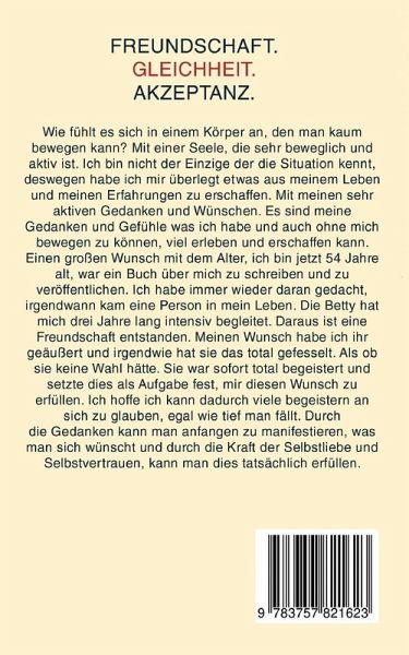 Wie der Titel schon sagt, soll der Inhalt des Buches eine Atmosphäre der Akzeptanz schaffen. Der oder die Leser/innen können sich in einen Menschen versetzen, der ganzheitlich gelähmt ist und Empathie entwickeln. Dadurch auch Offenheit und Akzeptanz. Ein friedliches Miteinander kann dadurch noch besser entstehen.