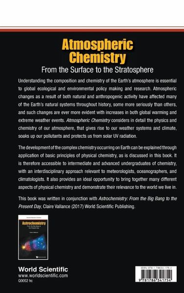 Understanding the composition and chemistry of the Earth's atmosphere is essential to global ecological and environmental policy making and research. Atmospheric changes as a result of both natural and anthropogenic activity have affected many of the Earth's natural systems throughout history, some more seriously than others, and such changes are ever more evident with increases in both global warming and extreme weather events. Atmospheric Chemistry considers in detail the physics and chemistry of our atmosphere, that gives rise to our weather systems and climate, soaks up our pollutants and protects us from solar UV radiation. The development of the complex chemistry occurring on Earth can be explained through application of basic principles of physical chemistry, as is discussed in this book. It is therefore accessible to intermediate and advanced undergraduates of chemistry, with an interdisciplinary approach relevant to meteorologists, oceanographers, and climatologists. It also provides an ideal opportunity to bring together many different aspects of physical chemistry and demonstrate their relevance to the world we live in. This book was written in conjunction with Astrochemistry: From the Big Bang to the Present Day, Claire Vallance (2017) World Scientific Publishing.