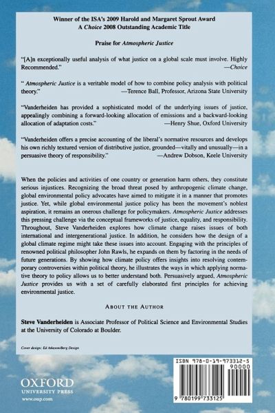 When the policies and activities of one country or generation harm both other nations and later generations, they constitute serious injustices. Recognizing the broad threat posed by anthropogenic climate change, advocates for an international climate policy development process have expressly aimed to mitigate this pressing contemporary environmental threat in a manner that promotes justice. Yet, while making justice a primary objective of global climate policy has been the movement's noblest aspiration, it remains an onerous challenge for policymakers. Atmospheric Justice is the first single-authored work of political theory that addresses this pressing challenge via the conceptual frameworks of justice, equality, and responsibility. Throughout this incisive study, Steve Vanderheiden points toward ways to achieve environmental justice by exploring how climate change raises issues of both international and intergenerational justice. In addition, he considers how the design of a global climate regime might take these aims into account. Engaging with the principles of renowned political philosopher John Rawls, he expands on them by factoring in the needs of future generations. Vanderheiden also demonstrates how political theory can contribute to reaching a better understanding of the proper human response to climate change. By showing how climate policy offers insights into resolving contemporary controversies within political theory, he illustrates the ways in which applying normative theory to policy allows us to better understand both. Thoroughly researched and persuasively argued, Atmospheric Justice makes an important step toward providing us with a set of carefully elaborated first principles for achieving environmental justice.