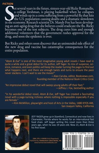 Set several years in the future, sixteen-year-old Ricky Romanello, a college freshman, is playing basketball when he collapses and winds up in a coma suffering from a powerful flu that hits the U.S. population causing deaths and a dramatic economic slowdown. Research scientist Dr. Mandy Fox has been developing an anti-aging drug that she believes might also eradicate the flu. Ricky becomes one of the test subjects. The government rushes approval for the drug but Ricky and others soon discover there is an unintended side effect of the new drug and vaccine with severe consequences for him and for the entire population. Praise for ATOM & EVE: ¿Atom and Eve¿ is one of the most imaginative young adult novels I have read in quite a while and a great debut for its author, Jeff Yager. Its mix of suspense, science, romance, and even politics will keep the reader turning the pages to find out what happens next, and there are enough twists and turns to ensure the pace never slackens. I can't wait to see the movie!"¿Alan Caruba, Editor, Bookviews.com, Founding member of the National Book Critics Circle About the Author: Jeff Yager grew up in Stamford, Connecticut and now lives in Clearwater, Florida. Atom and Eve is his first novel.