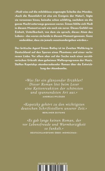 London zu Beginn des Zweiten Weltkriegs. Eigentlich will Simon Batley nie wieder mit dem britischen Geheimdienst zu tun haben. Jahre zuvor, als Physikstudent in Berlin, arbeitete er ihm zu, naiv und undercover. Das führte zu einer Katastrophe, die Batley nie ganz verstand, auch seine große Liebe zu seiner Kommilitonin Hedi von Treyden endete jäh. Doch der Krieg ändert alles. Agent Batley stößt auf die Spur einer neuen Waffe der Deutschen, von nie gekannter Zerstörungskraft. Bald darauf, instruiert von Niels Bohr und Rudolf Heß, reist er als Spion nach Lissabon - und schließlich ins Dritte Reich. Er will den mysteriösen Hans Kammler aufspüren: Der ist als Chefplaner von unterirdischen Forschungsstätten und geheimen Waffenprogrammen einer der mächtigsten Nazis. Während Batley versucht, vor den Sowjets und den USA an die deutsche Technik und an Kammler zu kommen, folgt er auch einer persönlichen Mission: Er will Hedi wiederfinden und endlich klären, was damals in Berlin geschah.