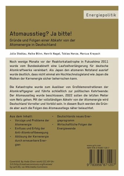 Fachbuch aus dem Jahr 2014 im Fachbereich Umweltwissenschaften, , Sprache: Deutsch, Abstract: Noch wenige Monate vor der Reaktorkatastrophe in Fukushima 2011 wurde vom Bundeskabinett eine Laufzeitverlängerung für deutsche Atomkraftwerke vereinbart. Als Japan den atomaren Notstand ausrief wurde deutlich, dass nicht einmal ein Hochtechnologieland wie Japan die Risiken der Kernenergie sicher beherrschen kann. Die Katastrophe wurde zum Auslöser von Großdemonstrationen der Atomkraftgegner und führte schließlich zur politischen Kehrtwende: Der Atomausstieg wurde beschlossen, 2022 sollen die letzten Meiler vom Netz gehen. Mit der vollständigen Abkehr von der Atomenergie wird Deutschland Vorreiter und Vorbild sein. In diesem Buch werden die Gründe aber auch die Folgen des Atomausstiegs näher beleuchtet.Aus dem Inhalt: Vorzüge und Probleme der AtomenergieEinfluss und Erfolg der Anti-AtomkraftbewegungAblösung der Kernenergie durch erneuerbare EnergienDeutschlands neues EnergieprogrammWirtschaftliche Folgen der Energiewende