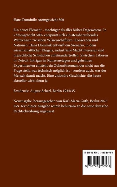 Hans Dominik: Atomgewicht 500 Ein neues Element - mächtiger als alles bisher Dagewesene. In »Atomgewicht 500« entspinnt sich ein atemberaubendes Wettrennen zwischen Wissenschaftlern, Konzernen und Nationen. Hans Dominik entwirft ein Szenario, in dem wissenschaftlicher Ehrgeiz, industrielle Machtinteressen und menschliche Schwächen aufeinandertreffen. Zwischen Laboren in Detroit, Intrigen in Konzernetagen und geheimen Experimenten entsteht ein Zukunftsroman, der nicht nur die Frage stellt, was technisch möglich ist - sondern auch, was der Mensch damit macht. Eine visionäre Geschichte, die heute aktueller wirkt denn je. Erstdruck: August Scherl, Berlin 1934/35. Neuausgabe, herausgegeben von Karl-Maria Guth, Berlin 2025. Der Text dieser Ausgabe wurde behutsam an die neue deutsche Rechtschreibung angepasst. Gesetzt aus der Minion Pro, 11 pt. Henricus - Edition Deutsche Klassik GmbH